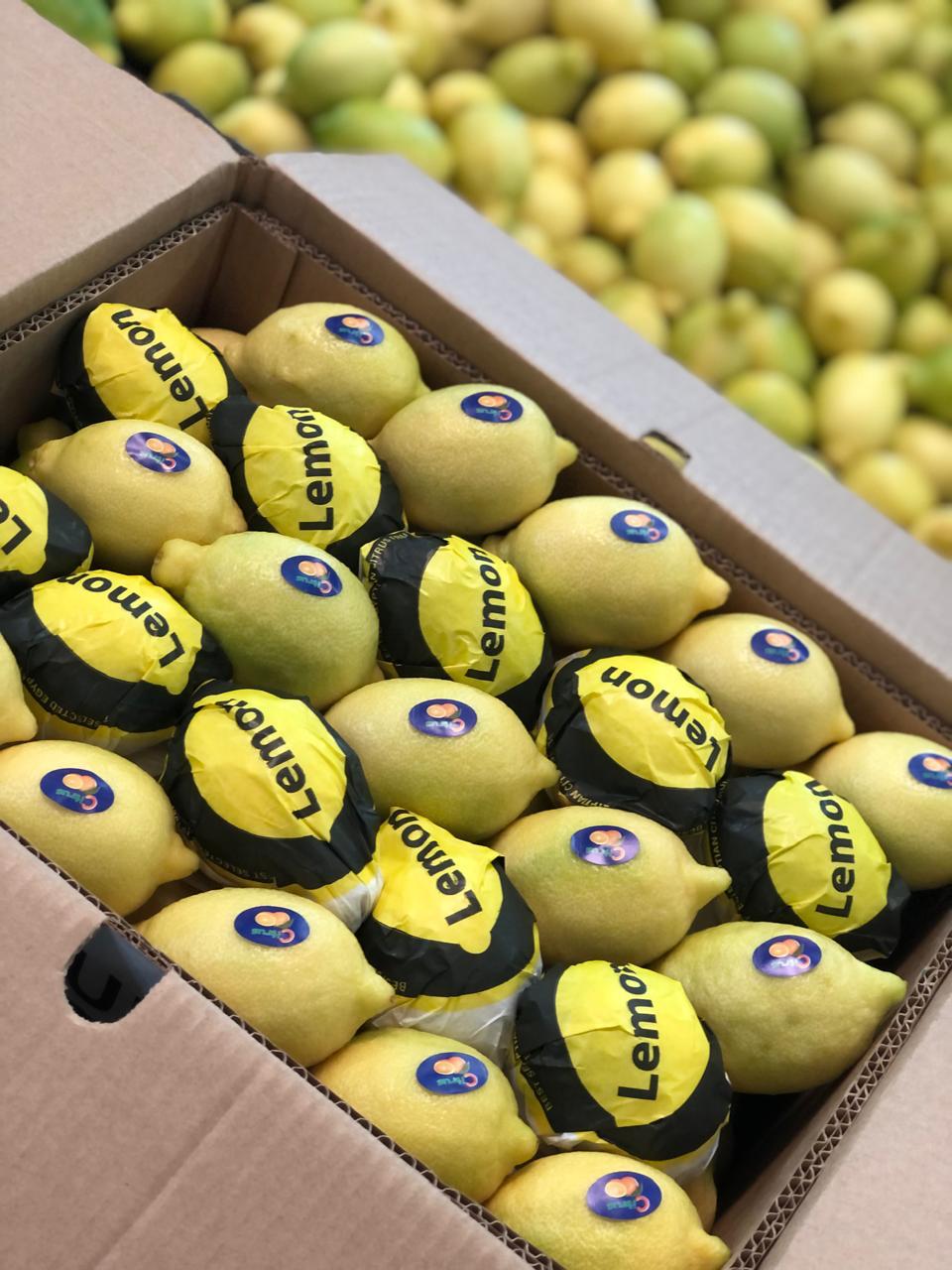 Fresh, bright lemons packed in durable export cartons — sorted for size and ready for international markets.